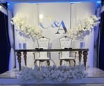 Create a breathtaking focal point for your special event with our luxury sweetheart table backdrop. This stunning setup features a modern white paneled wall with a custom monogram design, beautifully accented with lush white floral arrangements that extend gracefully across both sides.