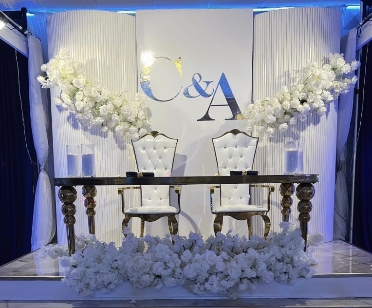 The look is completed with a sophisticated sweetheart table, paired with two high-back tufted chairs, giving a royal and elegant feel—perfect for weddings, engagements, and upscale celebrations.