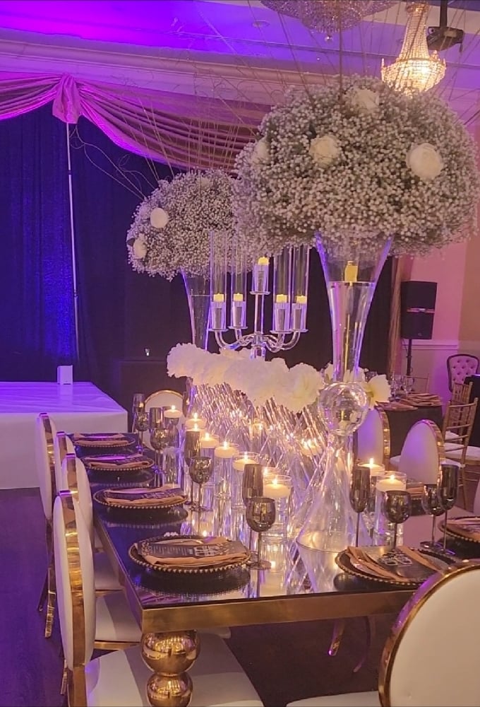 Gold Stainless Steel table with a glass top Setup with 12 luxury chairs and decor design as picture